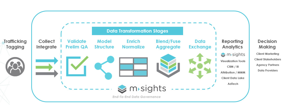 This step unifies or transforms data by normalizing, enriching, harmonizing, and classifying data with cloud management tools. This makes your data actionable and ready for analysis. This means you can manage all your media and creative details directly in MSIGHTS. It creates data rules to auto-populate data into key data groupings. This sets aliasing to automap for future data integrations, and it creates custom metrics and attributes on the fly.